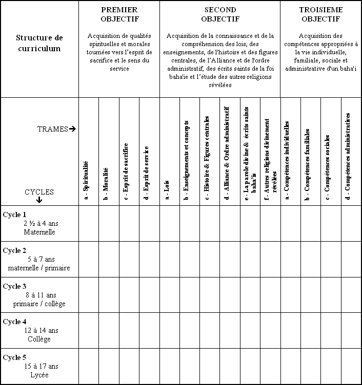 Ce serait un exercice intéressant et utile pour un enseignant baha'i de prendre le tableau de structure du curriculum du chapitre huit et de cocher, pour la tranche d'âge qu'il enseigne, chacune des cases correspondant aux leçons dispensées pendant un an, et observer ensuite quels sont les trames surinvestis et ceux qui ont été négligés. Il pourra alors déterminer comment s'est situé son programme annuel et l'ajuster en conséquence pour l'année suivante. Cette pratique est appelée "audit du curriculum."