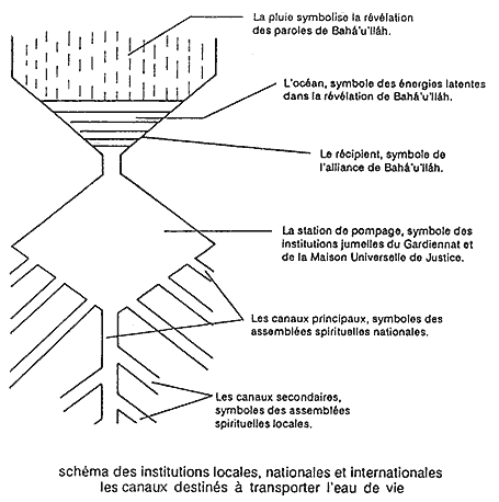 Pour reprendre l'analogie du réservoir et des canaux, on pouvait dire que Shoghi Effendi agissait comme une station de pompage reliant l'océan de la révélation de Baha'u'llah à un vaste réseau d'assemblées locales et nationales. De même que l'eau est pompée du réservoir pour se déverser d'abord dans les canaux principaux puis dans les canalisations locales d'où, pure et non polluée, elle coule dans toutes les maisons, de la même manière, les forces de la foi de Baha'u'llah, capables de vivifier le monde, étaient puisées au Centre mondial et irriguaient, par l'intermédiaire du Gardien, les assemblées nationales et, via celles-ci, les assemblées locales du monde entier. De cette façon, l'esprit de la foi s'écoulait jusqu'aux hommes sans être corrompu par l'homme. Avec l'établissement de la Maison Universelle de Justice, peu de temps après le décès de Shoghi Effendi, fut érigé l'édifice suprême de l'ordre administratif de Baha'u'llah. Aujourd'hui, les forces de la foi, à même de vivifier le monde et contenues dans l'océan de la révélation de Baha'u'llah, s'écoulent de la Maison Universelle de Justice dans un vaste réseau d'assemblées spirituelles nationales et locales, donnant la vie spirituelle à des multitudes dans toutes les parties du monde.