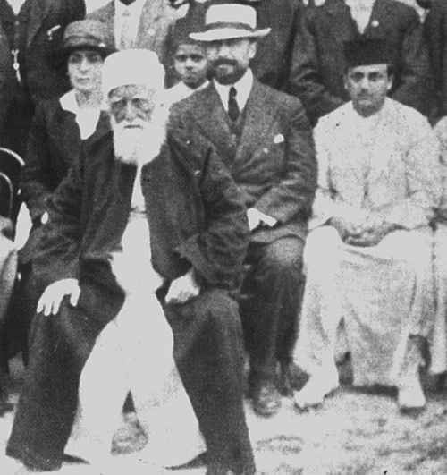 Photo O : Hippolyte Dreyfus et sa femme Laura derrière Abdu'l-Baha, assis