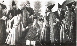 Photo: Personnalités de la cours de Muhammad-Shah: au centre le jeune garçon est Nasiri'd-Din, le prince héritier. A sa droite derrière lui,Mirza Abdu'l-Qasim, Qa'im-Maqam; à sa gauche, Haji Mirza Aqasi. A gauche de l'image on aperçoit Manuchir-Khan, Mu'tamidu'd-Dawlih, le gouverneur d'Ispahan. Entre les deux, Mirza Abdu'l-Hasan Khan-i-Ilchi, ambassadeur persan en Grande-Bretagne qui inspira le personnage de Mirza Firouz dans le livre de Morier: Hajji Baba d'Ispahan.