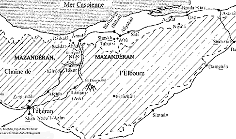 Photo: Carte du nord de la Perse montrant la province du Mazanderan, Téhéran et quelques-uns des lieux associés au commencement de la vie de Baha'u'llah.