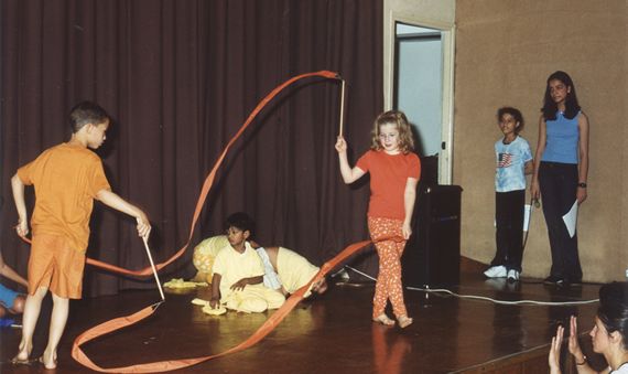 Sujet: Chorégraphie lors de la fête de fin d'année de l'école baha'ie à Paris en juin 2001 à l'Uneco dans la cadre de l'année internationale pour la paix votée à l'ONU. | Lieux: