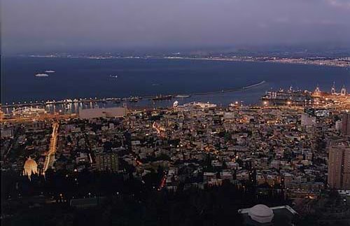 Vues nocturnes de la terrasse 19 et de la baie de Haifa au sommet du mont Carmel.