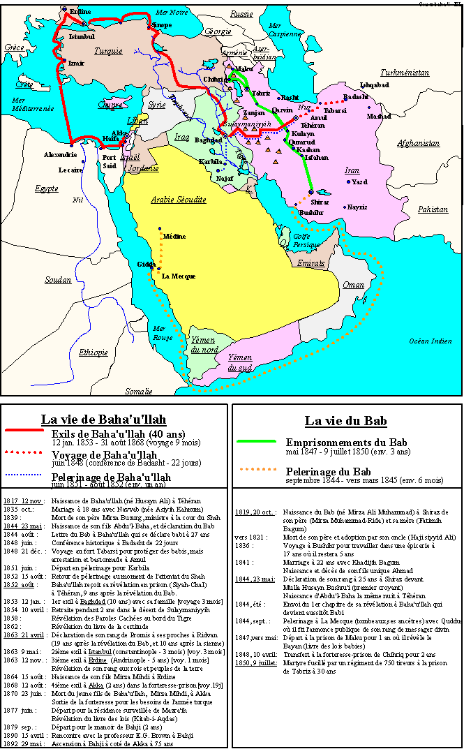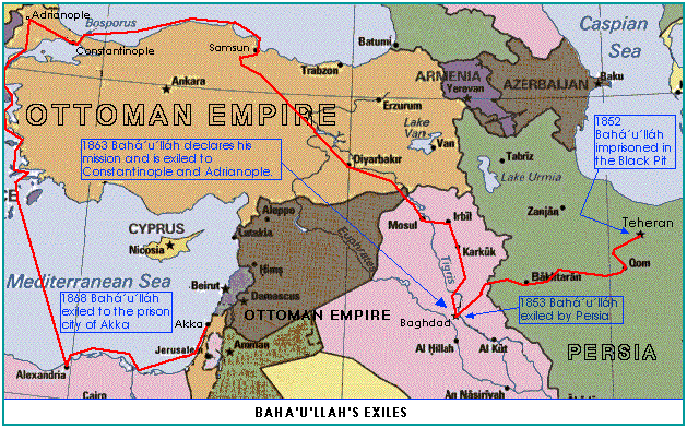 | Sujet: Carte de l'itinéraire de Baha'u'llah en exil (avec 4 exils successifs: de Téhéran à Baghdad, puis Constantinople, puis Andrinople, puis Akka). | Lieux: