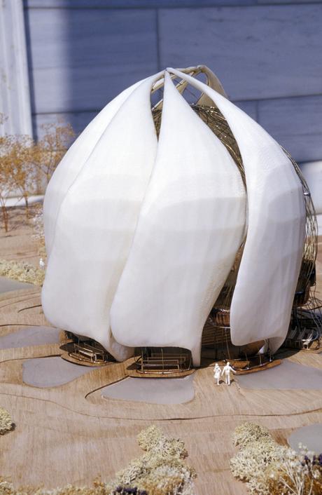 Les feuilles translucides en pierre constituent la coquille extérieure du Temple, avec une délicate dentelle de bois pour surface intérieure.