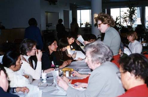 Sujet: Aux Nations Unies, des ONG (Organisations Non Gouvernementales) lors de la Commission sur le Statut de la Femmes se sont focalisées sur "les Stratégies pour la Mise en oeuvre de la Plate-forme de Beijing pour l'Action 2000 et Au-delà". Ici on voit les membres du Comité sur les Mécanismes Institutionnels. | Lieux: